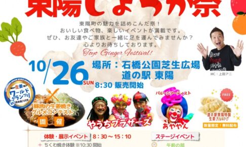 東陽しょうが祭が10月26日に開催!今年も香り豊かな新ショウガを楽しもう【2025】 東陽町の一大イベント「東陽しょうが祭」が2025年10月26日(日)に開催されます。品評会に出品されたショウガをはじめ、葉付きショウガ…